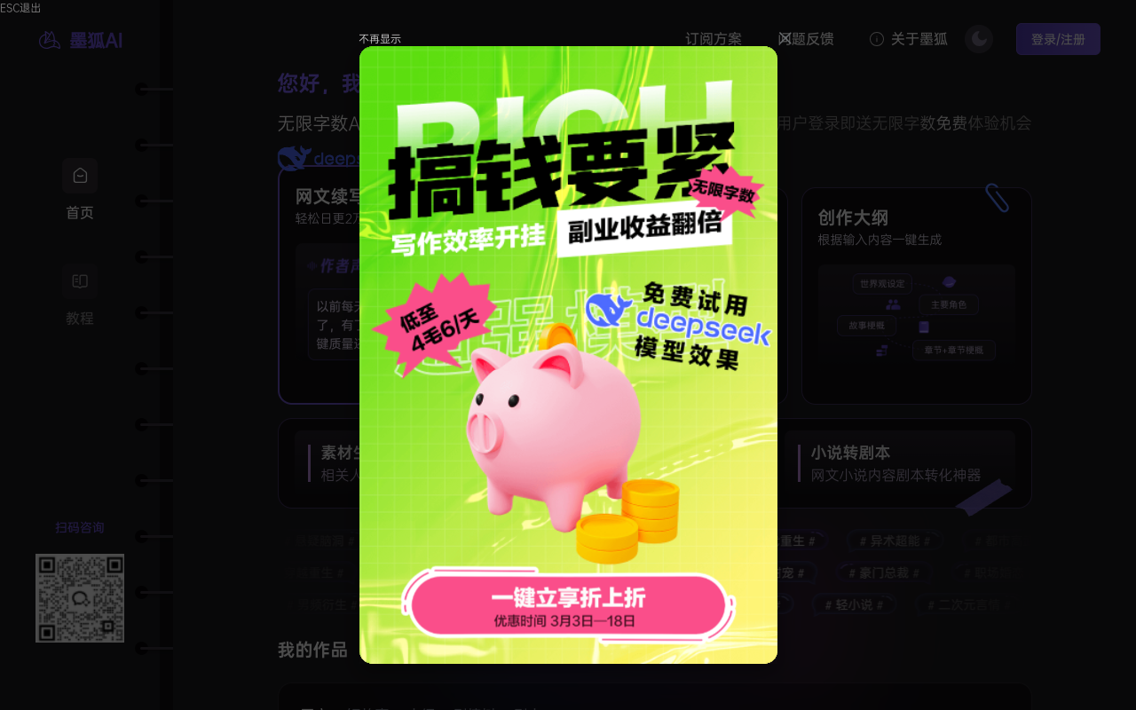 墨狐AI是一个给码字的人准备的智能帮手,尤其对写网络小说和短篇故事的朋友很友好。它的核心任务很简单:当你没灵感、卡文或者不知道故事该怎么往下编的时候,拉它一把。它负责提供框架、续写段落、整理思路,但最终的故事灵魂和笔触,还是牢牢握在你自己手里。