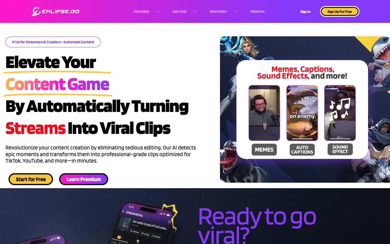 Eklipse.gg 是一个用AI帮游戏主播“偷懒”的在线平台。它的主要工作,就是把你的游戏直播流,自动变成适合在TikTok、Instagram Reels和YouTube Shorts上发布的短视频高光片段。如果你在Twitch或Kick上直播,它能让剪辑过程几乎全自动,帮你抓住那些容易错过的精彩瞬间。