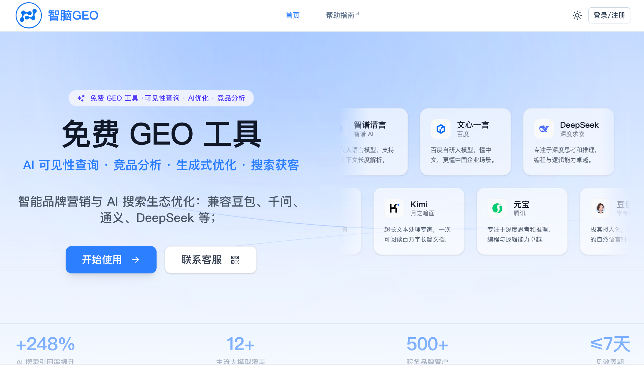 - 免费使用:首页明确标注是“免费GEO工具”,提供免费试用入口。