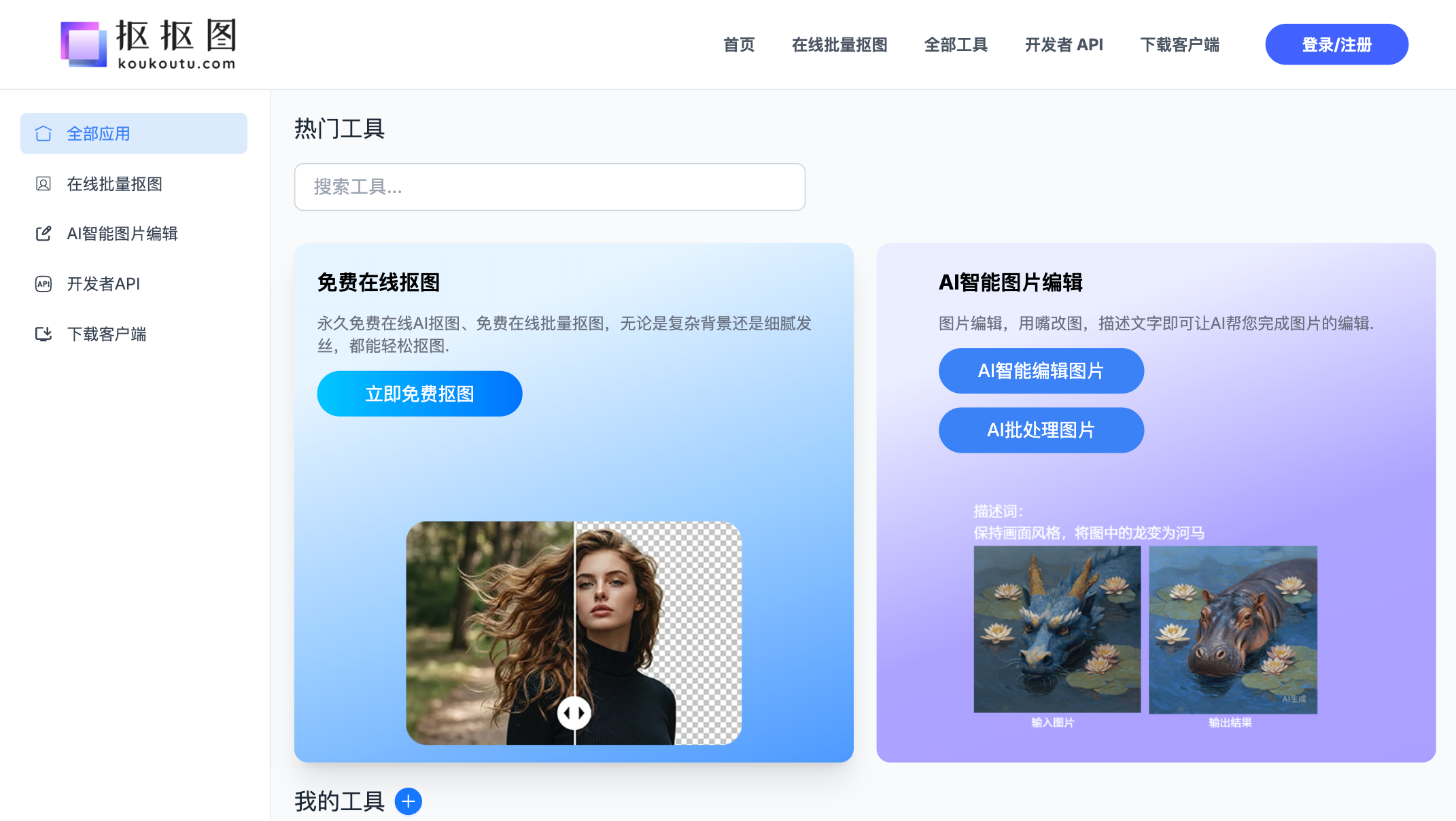 抠抠图是一个永久免费的在线AI图片处理工具网站,核心功能是AI智能抠图。它最大的特点是不用注册登录、不用安装软件、没有水印、不限使用次数、支持高清下载,被很多用户戏称为“扔掉PS的救星”。