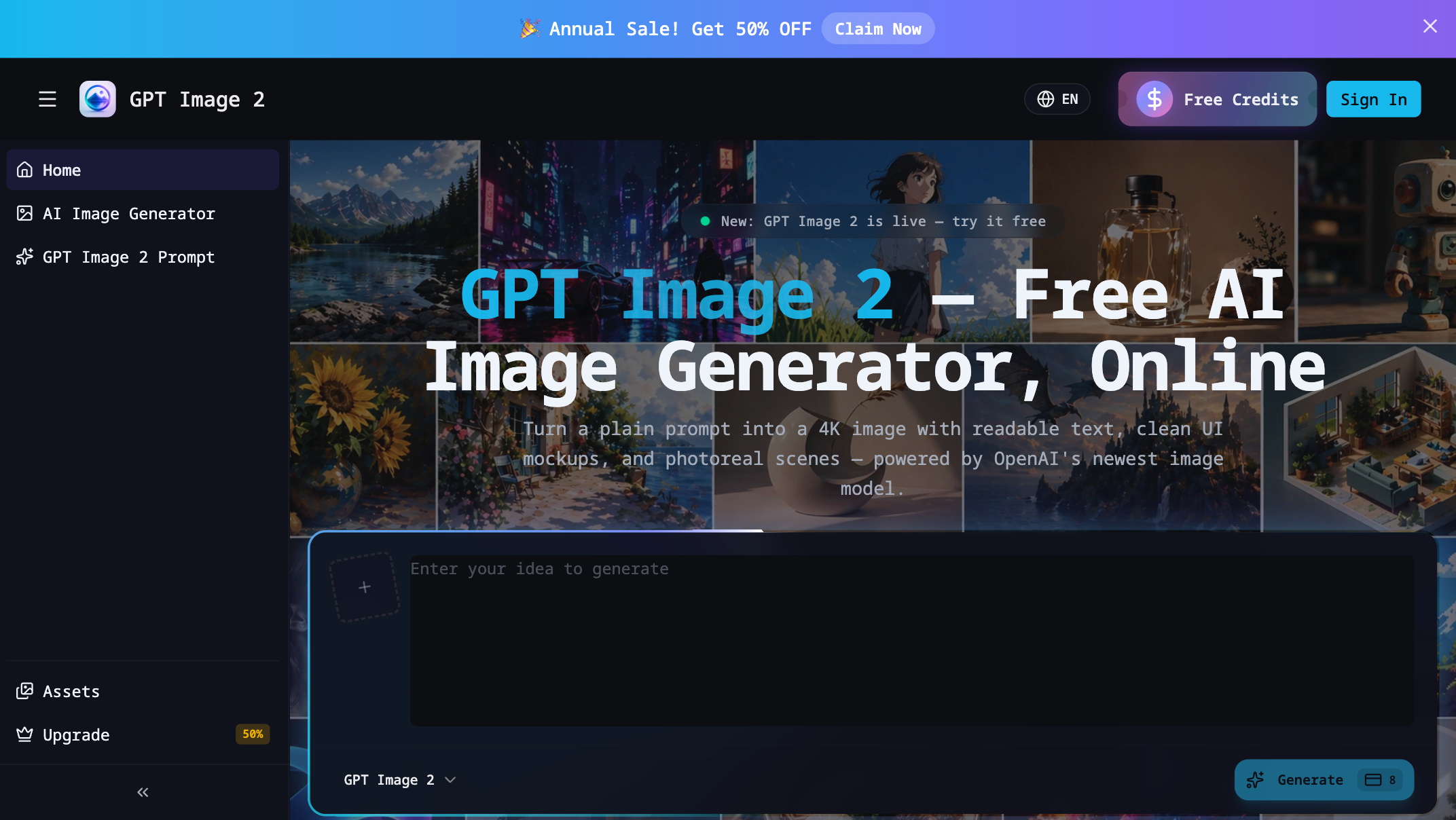 genimageai.app 是一款基于 OpenAI 最新图像模型 GPT Image 2(又称 ChatGPT Images 2.0) 打造的免费在线 AI 图像生成工具。主打高精准文字渲染、多语言支持、4K高清、无水印、可商用,无需本地部署、无需信用卡,注册即用。适合电商、营销、设计、内容创作等场景快速出图。