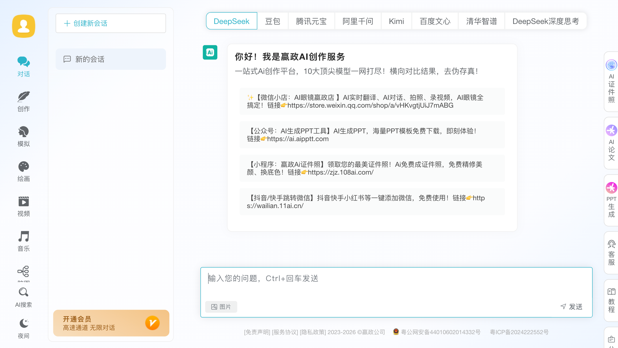 嬴政AI创作服务 是赢政公司推出的一站式多模态生成式AI创作平台。名字霸气,理念也霸气——号称“一统天下”,要把全球顶尖AI模型都收归旗下,让普通人也能低成本用上国际前沿技术。平台整合了DeepSeek V3、字节豆包、Kimi、阿里通义、腾讯混元、百度文心、清华智谱等十大国内大模型,覆盖内容创作、效率提升和创新突破。更特别的是,它还有AI眼镜这类硬件产品,支持翻译、拍摄等,软硬结合,生态挺完整。截至2026年,已服务数百万用户,主打零门槛创作和模型横向对比,适合从日常办公到专业创作的各种场景。